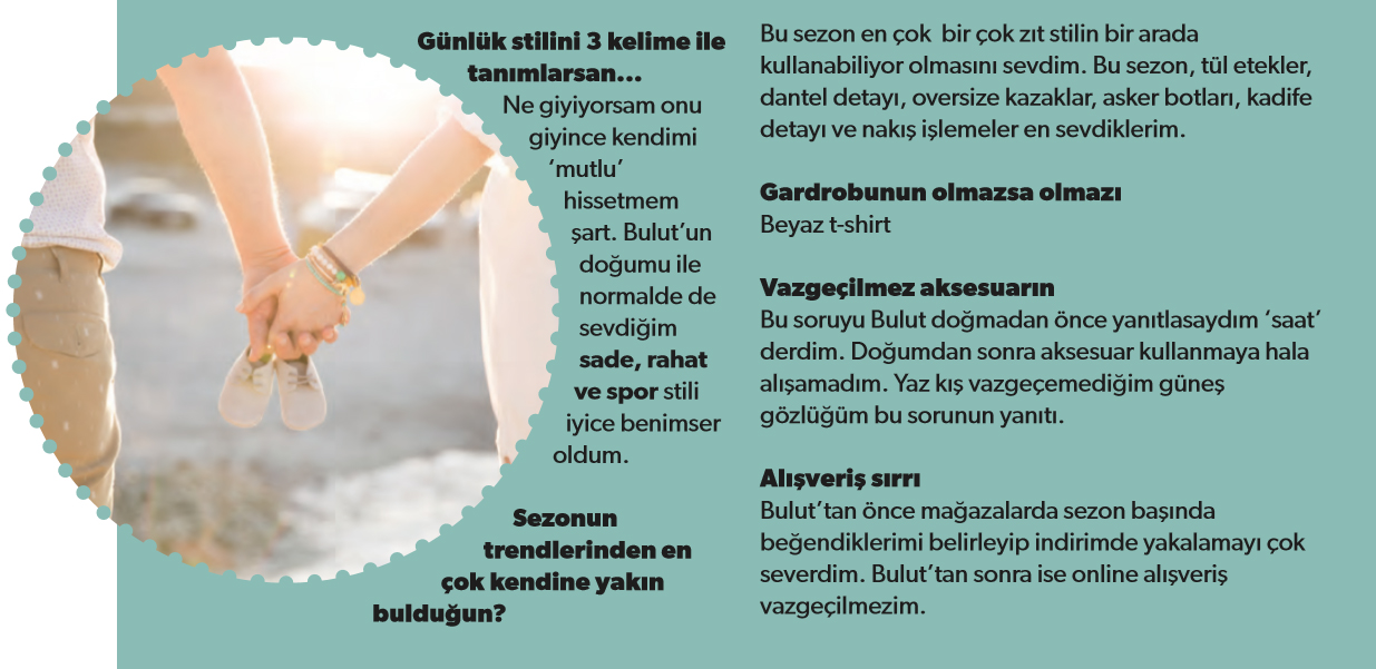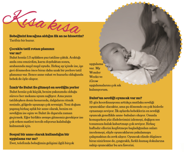Hayatım yepyeni bir boyut kazandı. ‘Annelik’ bütün sorumlulukların en güzeli, hayatta bugüne kadar yaptığım şeyler arasında en anlamlısıymış. Bulut ile birlikte, hayatımdaki önceliklerin sırası değişti. Onun tüm ‘ilk’lerinde yanında olmak, onunla birlikte hayatı öğrenmek kesinlikle çok güzel.