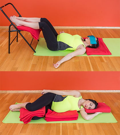 Yan yatarak pozda kalmak için yan yatmak üzere (sol tarafınıza doğru yatarak) karnınızın ve başınızın altına battaniye yerleştirin. Bacaklarınızın arasına da bir battaniye ya da bolster yerleştirin ve tüm bedeninizi gözden geçirerek rahatlamasına izin verin. Bu şekilde 5-10 dakika arası kalın.
