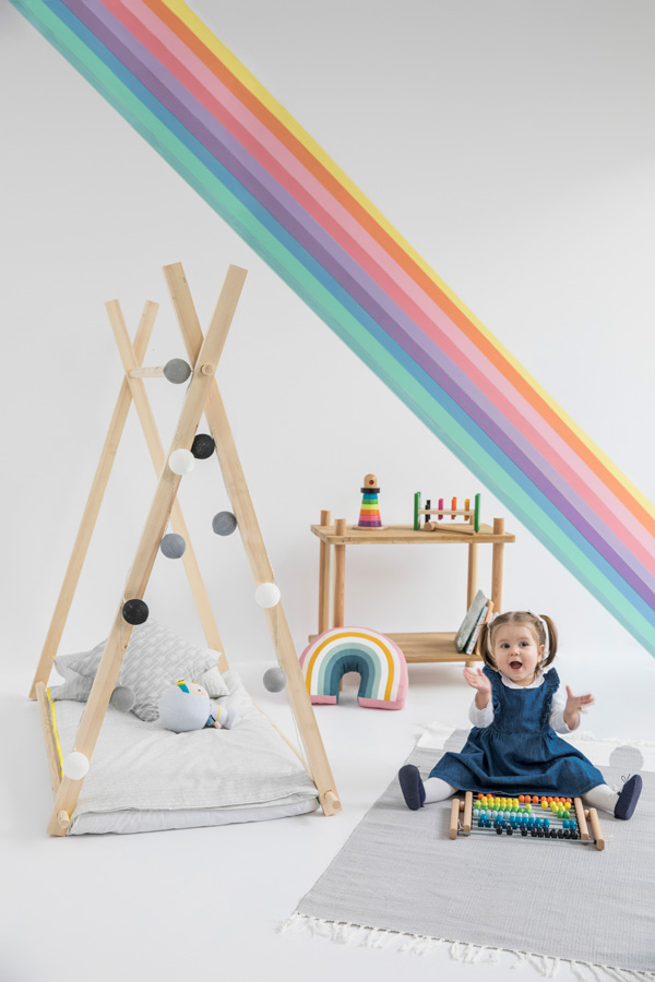 Çocuk odasında, vurgularda bol renk kullanmaktan çekinmeyin, renklerin olumlu enerjisini ufak dokunuşlarla onlara da geçirebilirsiniz. Duvara basitçe uygulayacağınız dümdüz bir gökkuşağı onlara renkleri öğretirken en sevimli dostları olacak. Zihin açıcı etkisiyle mor tonları ve sakinleştirici etkisiyle turkuaz tonlarının yarattığı kombinasyonunu etkisini deneyin.