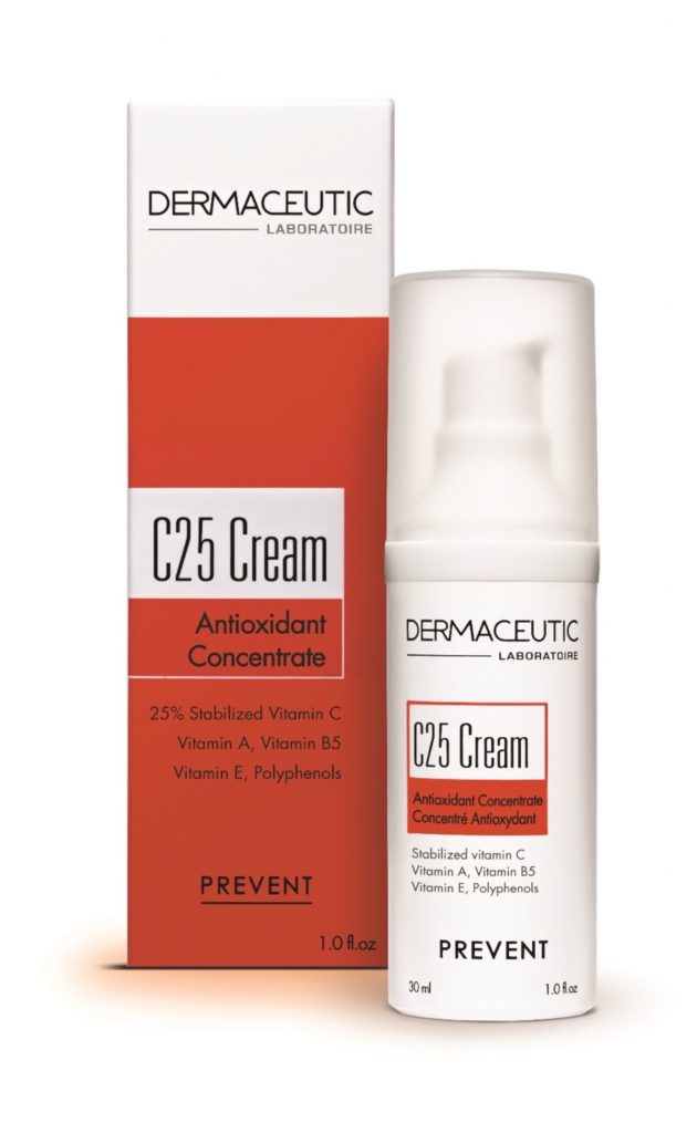 - Dermaceutic C25 kremin konsantre formülü, %25 stabilize Cvitamini, A, B5 ve E vitaminleri ile doğal olarak bitki ve meyvelerde bulunan polifenoller içeriyor, cildin erken yaşlanmaya karşı korunmasına, serbest radikallerin etkilerine karşı savaşarak cildin kolajen bütünlüğünün korunmasına, kırışıklıklar, ince çizgiler, pürüzlü cilt yüzeyi ve hiperpigmentasyon gibi yaşlanma belirtilerine karşı cildin verdiği savaşı destekleyerek yardımcı oluyor. Cilt tonunun eşitlenmesine ve doğal ışıltıyla parlamasını sağla 455TL.