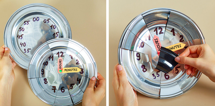 2 kağıt tabak al. İlkinde dakikaları (0, 5, 10, 15, vb.) simgeleyen numaraları yazın. Daha sonra Diğer tabağa 1’den 12’ye kadar sayıları yazın ve diğer plaka üzerinde küçük kesimler yapın. İlk plakayı ikincisinin altına koyun.