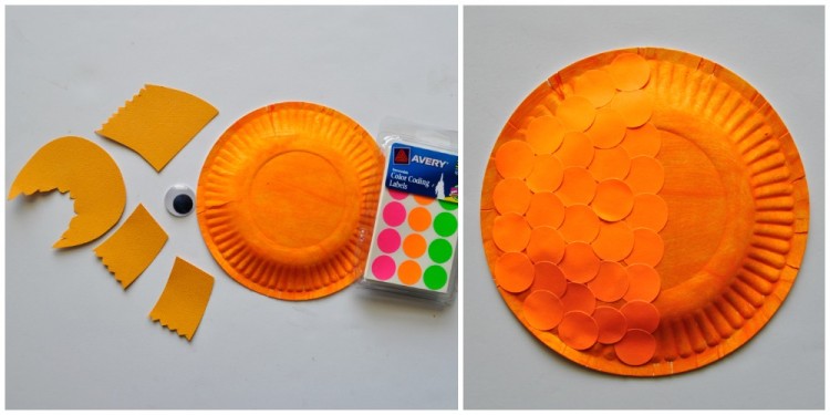 Balığın pullarını oluşturmak için turuncu renkli stickerları kullanın. Eğer daha renkli pulları olsun istiyorsanız başka renklerde kullanabilirsiniz.