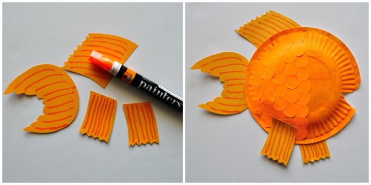 Nemo’nun süzgeçlerini ve kuyruğunu yapmak için turuncu kağıtları istediğiniz formda kesin ve keçeli kalemle çizgiler çizin.