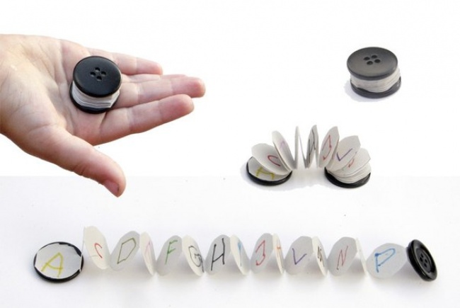 İhtiyacınız olan 2 düğme ve bir kağıt. Kağıdı fotoğrafta gösterildiği şekilde kesin ve düğmenin içine yapıştırın. Akordiyon haline gelen kağıda, alfabenin harflerini yazın. Açtıkça ezberlemesi daha kolay olacaktır, eğlenmesi de cabası.