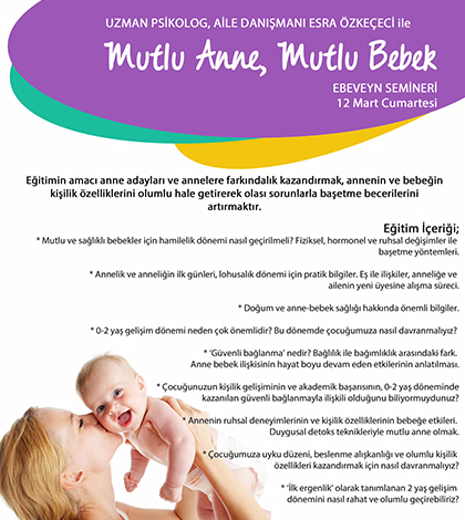 12 Mart Cumartesi MK Yoga Merkezi’nde; Uzman Psikolog, Aile Danışmanı Esra Özkeçeci ile “Mutlu Anne, Mutlu Bebek” Ebeveyn Semineri düzenleniyor.Eğitimin amacı ise; anne adayları ve annelere farkındalık kazandırmak, annenin ve bebeğin kişilik özelliklerini olumlu hale getirerek olası sorunlarla başetme becerilerini artırmak.