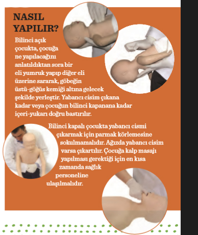 Yabancı cisme bağlı ölümlerin %90’ı beş yaş altında görülür. Kısmi tıkanma/ tam tıkanma ayrımı yapılmalıdır. Yabancı cismi çıkartmak için yapılan manevralar süt çocuğunda sırt/göğüs vuruşu, bir yaş sonrasında karın manevrasıdır. En önemli noktalardan biri kendiliğinden öksüren ve solunum çabası olan çocuğa müdahale edilmemesidir. Ancak, öksürük yetersizse, çocuğun sesi kesilirse, solunum sıkıntısı artarsa, çocuk tepki vermemeye başlarsa kısa zamanda çocuğa yardım etmek için ilk yardım uygulamalarına başlanır. Süt çocuğunda bir el ile göğüs desteklenerek baş gövdeden daha aşağıya kaydırılır. Diğer elin topuğu ile sırta, iki kürek kemiği arasına 5 kez vurulur. Cisim çıkmamışsa, bebek sırtüstü pozisyona getirilir. Bir el ile sırt ve baş desteklenerek hafif baş aşağı pozisyonda tutulur. Göğüs kemiğinin alt yarısına baş yönüne doğru bası yapılarak göğüs kafesi toplam 5 kez sıkıştırılır. Bebeklerde karına baskı yapılmamalıdır.