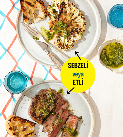 3. Karnabahar ve etleri hazırladığınız tabaklara alın. Her bir bifteğin sosu emmesi için arada çevirerek 10 dakika dinlendirin. Kalan chimichurri sosunu üzerilerine dökün.