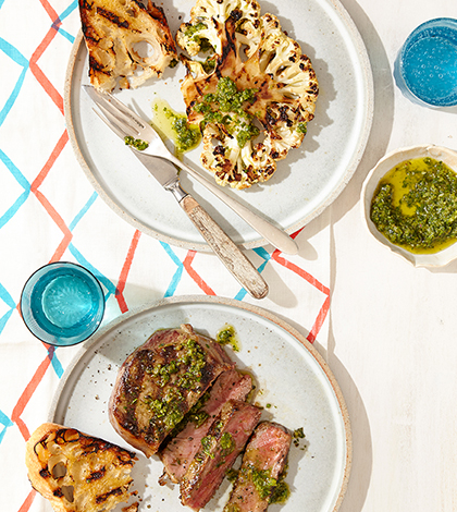 2. Yağladığınız ızgarayı ısıtın. Karnabahar ve etleri tuz ve karabiberle çeşnileyin. Karnıbaharları sürenin yarısında ters çevirerek 14-16 dakika pişirin. Etleri 8-10 dakika veya istenilen pişmişliğe göre ızgara yapın.
